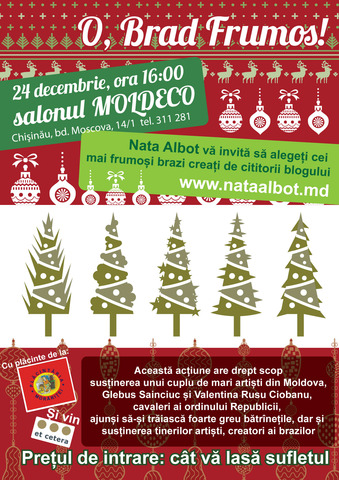 Din cite am inteles eu ideea acestui concurs era promovarea tinerelor talente din tara…in total ai adunat 80 de brazi ai selectat 30 pentru expozitie cu vinzare,pentru colectare unor resurse financiare pentru a sustine alti artisti.Atunci de ce sa nu expui pe toti 80 de brazi,iar dintre acestia sa ii alegi pe cei 3 care o sa fie cistigatori a unor premii banesti. Si restul sa fie procurati de vizitatori.Daca 30 incap in sala de la Moldeco, cred ca o sa incapa si ceilalti 50(ca nici nu sunt foarte mari)..Astfel vei cistiga din ambele parti-fonduri mai multe, si pe ceilalti 50 de creatori de brazi impacati,ca pina la urma fiecare din cei care au facut cite un brad,a facuto cu gindul sa participe la aceasta expozitie.Vei face cu adevarat un tirg a brazilor eco si creatori se vor simti ca nu au depus munca in zadar….in fine era doar o parere 🙂