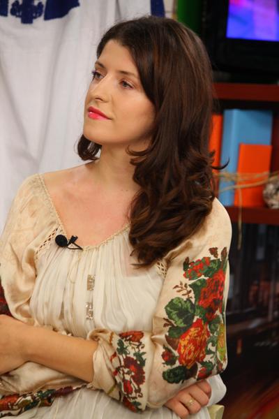 Iar Liliana Vițu, purtătoarea de cuvânt a primului ministru Leancă, a fost de acord să-și facă apariția în emisiunea noastră, purtând o ie pe care a primit-o de la mama sa în dar, pe vreamea când învăța la Londra. Când a apucat-o dorul de casă, mama i-a trimis niște conserve și…,această ie.