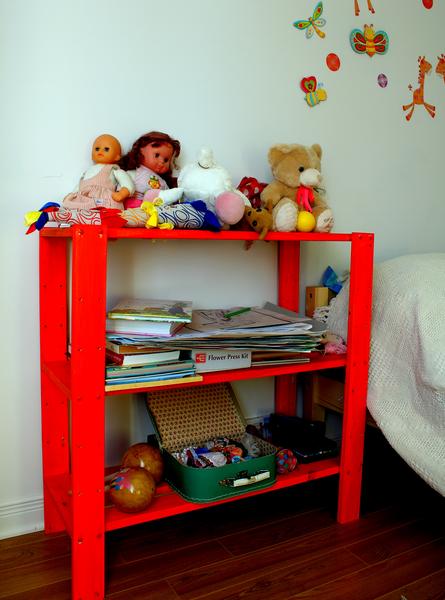 Îmi place culoarea etajerelor din camera fetelor. Eu am ales-o, eu le-am vopsit.